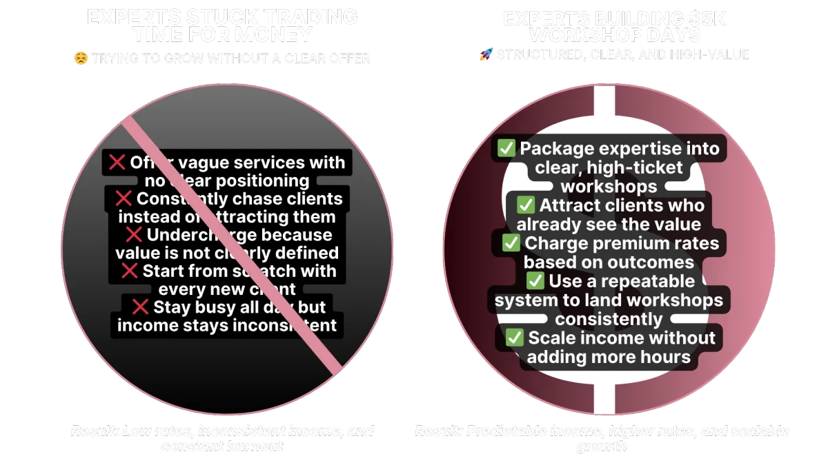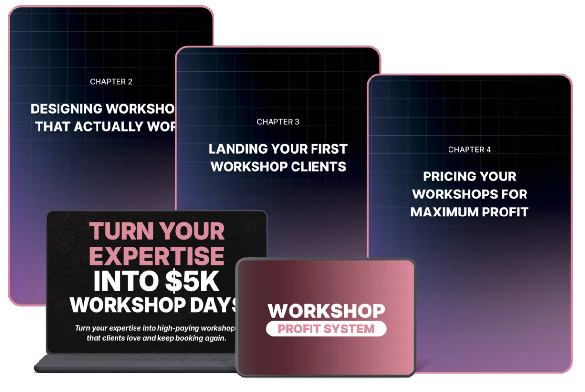 If you are ready to stop guessing, stop undercharging, and finally turn your expertise into consistent $5K+ workshop days, click below to get instant access to Turn Your Expertise Into $5K Workshop Days and start building your workshop income system today. 👇